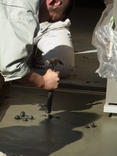 AZiTOのメインイベント!玄関ポーチの玉石埋込作業が完了しました。施主の I さん夫婦も参加して、オールメンバーでわいわいと。(写真がちっとも”わいわい”じゃないのはお気になさらずに・・・(笑))