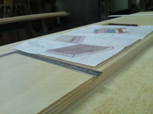 安普請にならないよう、小口がシマシマの共芯パネルという合板を使う事にしたのですが、ごまかしが効かないため、しかも形状がかなり複雑なため、神経をすり減らして制作してくれています。